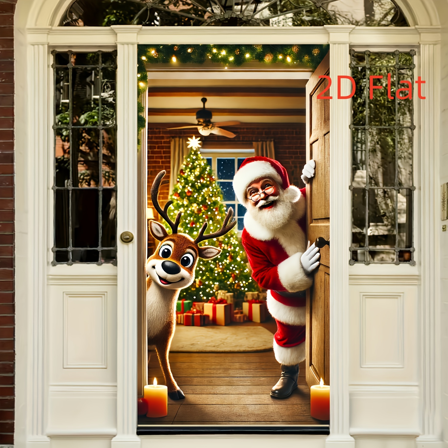Banner decorativo de porta com estampa do Papai Noel em estilo 2D plano, ideal para celebrar o Natal e o Ano Novo com charme. Feito em tecido de poliéster resistente, mede 177,8x88,9 cm e é perfeito para festas ao ar livre, fotos temáticas e decoração externa.