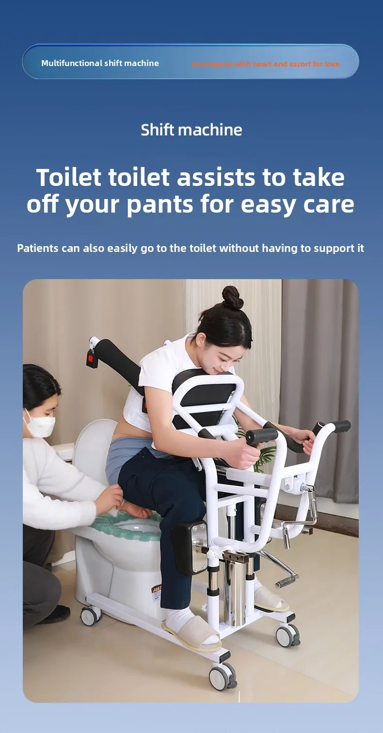 Cadeira hidráulica multifuncional para transferência de idosos, prática, segura e confortável para cuidados diários.